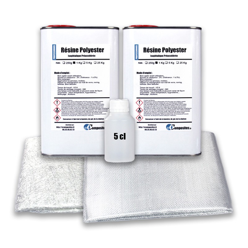 - Composition du kit : 2 x résine polyester de stratification isophtalique 1 kg, 1 flacon de catalyseur PMEC 10 cl, 2 m² de mat de verre 300 g/m² (1,25 m x 1,60 m), 1 m² de roving 300 g/m² (1,25 m x 0,80 m);